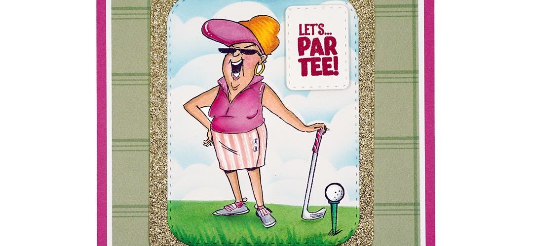 To finish the card, I stamped “Let’s…Par Tee!” in pink ink and die-cut it with a rounded rectangle before popping it up with foam tape. I also attached two clear rhinestones to her skirt for extra sparkle. Such a fun way to celebrate the challenge theme!
