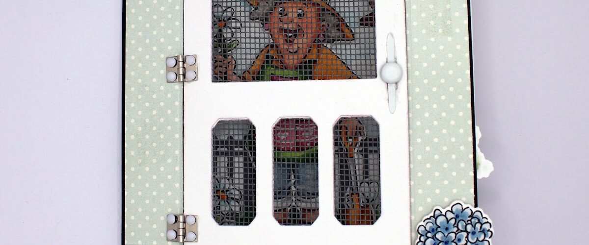 So…. I’m going to make a big confession here. I have had this screen door die for probably almost 15 years and I have NEVER used it. When I saw the theme of this challenge I decided it was finally time. I grabbed 6076 Gardener Gail and went to work. I used quite a few sets from Art Impressions to create this, and they’re all linked below.  I wanted the door to actually open on the front of the card, so I found some miniature hinges on Amazon and the tiny brads from Art Impressions are the PERFECT size for them! Don’t you think? I used a larger brad for the inside and outside doorknob.  I simply spread the tines all the way out and glued them in place. The screen in the door actually came with the die and is sandwiched between several layers of the die cuts. The die was made by Cheery Lynn Designs if you want to try and find one. I doubt it is still manufactured after all these years, but I would be surprised if there isn’t some kind of substitute die you could use.