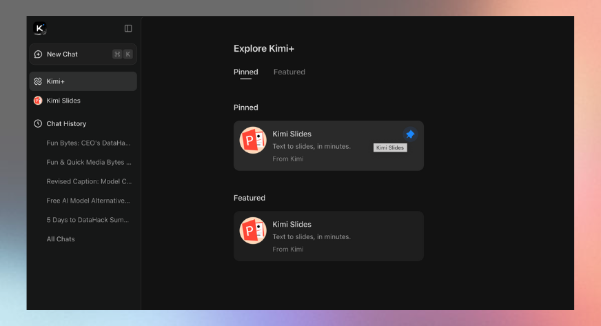With a Kimi+ subscription, users get access to a larger context window, faster inference, priority access to the latest models, and integrated plugins (also known as mini apps or agents). Kimi Slides is one of these plugins, extending the chat interface to instantly create presentations.