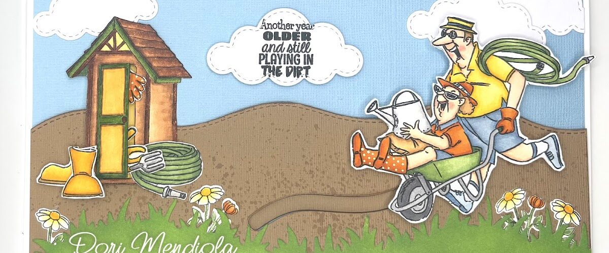 I started out by stamping the images onto copic friendly paper with Memento black ink and colored with copic markers listed below. I fussy cut the images. The garden shed is a watercolor stamp set and has a few garden pots at the base, so I just fussy cut them off and popped up the boots and garden hose over the cut area. I also cut an opening in the door and placed some tools and garden gloves inside. These accessories are from the #SC0650 – His & Hers Gardeners set. I also colored and cut some flowers from the #5935 – Fairytale Houses set.