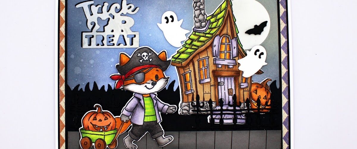 BOO!! Did I scare you? LOL! Halloween is such a fun time of year! I watch spooky tv shows all month long! I’ve got a fun card to show you today that features the new #6112 Pumpkin Parade and a couple older sets as well. That cute house is from #5934 Spooky Crew Set and the fun ghosts and bat are from #5604 Halloween Journal Die Set. I stamped the images onto a Copic friendly cardstock and then colored them up. I truly do love having the dies to cut the pieces out so it makes it so easy to create a scene like this! The fence in front of the house is also from the Halloween Journal Die Set. For the sidewalk, I just took a scrap piece of gray cardstock and drew in some lines. SUPER easy and grounds our little Trick or Treating fox as he makes his way down the street. For the moon, I simple cut out a piece of cardstock using #5726 Nested Circle Dies.