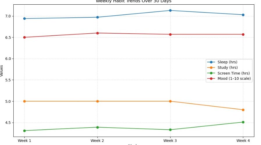 Week 1 – Average sleep: 6.94 hrs, Study: 5.00 hrs, Screen time: 4.31 hrs, Mood score: 6.50