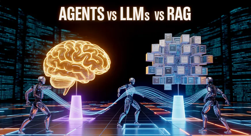 Artificial intelligence has advanced quickly, and the world of AI has transformed from chatbots that can write text to systems that can reason, retrieve knowledge and take action. There are three principal constructs of intelligence behind this progression: Large Language Models (LLMs), Retrieval-Augmented Generation (RAG), and AI Agents. Understanding LLMs vs RAG vs AI Agents comparison is essential to see how today’s AI systems think, learn, and act.