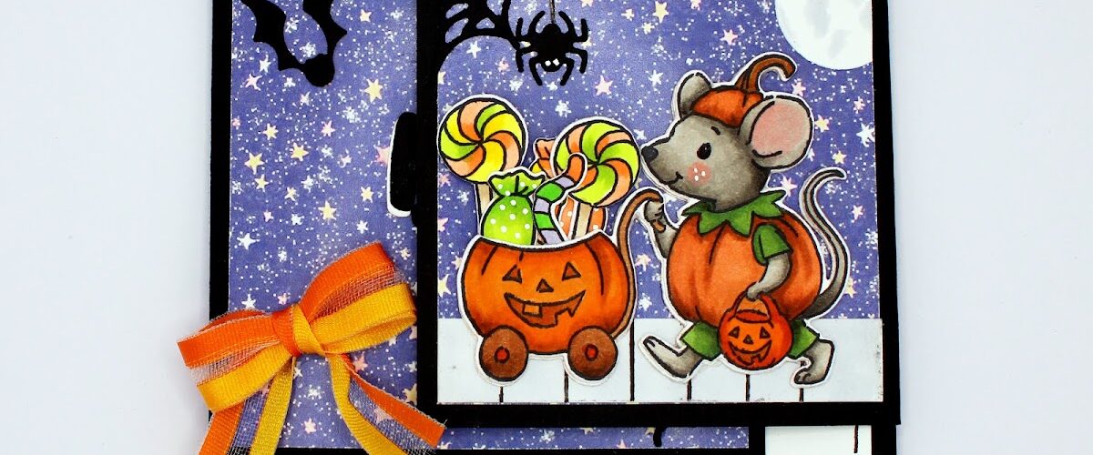 I know Halloween is over, but I have just one more card I want to show you that goes along with our current challenge “Along Came a Spider”. You still have a couple of days to enter! I used a fun fold for this one and had it where the right side overlaps the middle panel. I started out with #6112 Pumpkin Parade and colored up the adorable mouse pushing his cart full of candy down the street. To create this very easy scene, I grabbed a piece of paper from #6130 Halloween S3 PP and then used a piece of gray cardstock and drew in sidewalk lines. Couldn’t get any easier. Of course I added a little spider hanging from his web up in the corner. Just a little note that I used a set of magnets from Amazon to hold the top down. It’s just enough pull to keep it closed until you want to open it up. I simply glued one under the paper of the top flap, and the other one under the paper of the middle flap. It works like a charm!!
