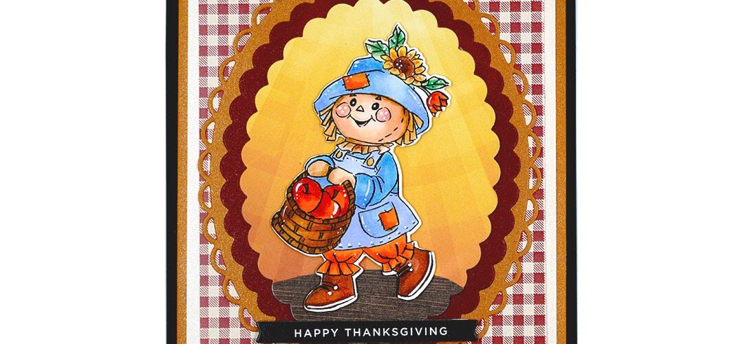 Thanksgiving is next week and Art Impressions has so many great Fall sets to create fun cards and projects. Today I used the 5507–Harvest Together Set to make a golden Fall design. I stamped the girl scarecrow and cut her out with the included dies; I just love her basket of apples! After die-cutting, I colored her with Copic Markers and used foam tape to pop her up in the center of the card.