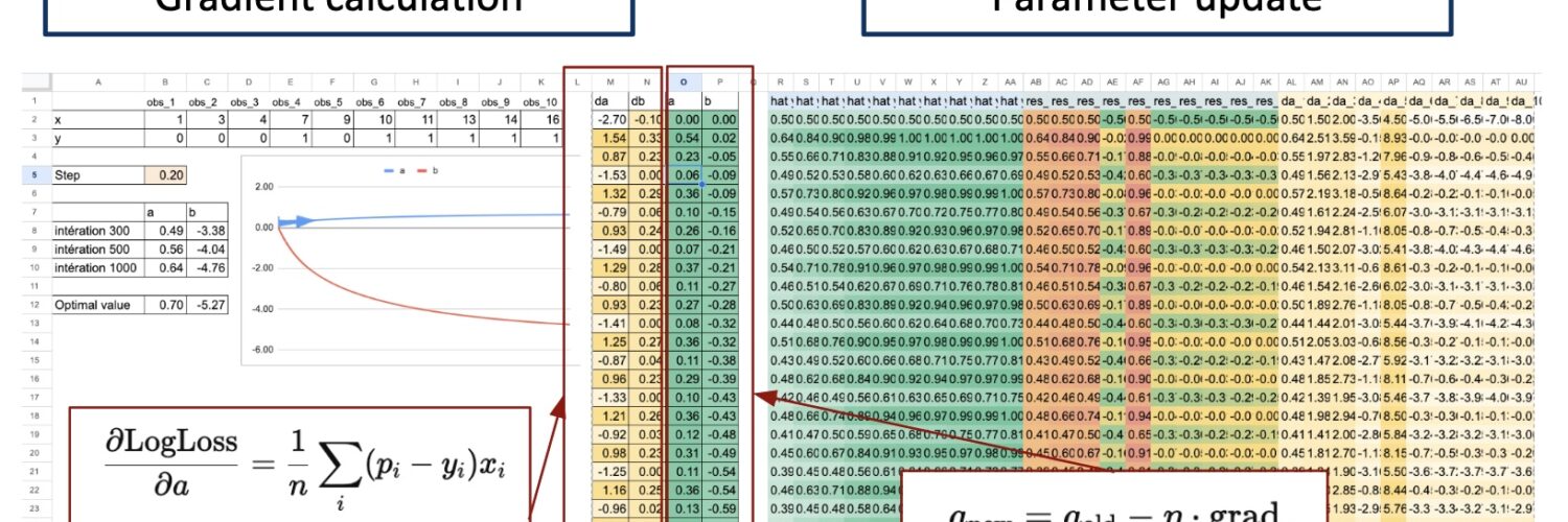 And with the detailed view of each iteration in Excel, you can actually play with the model: change a value, watch the curve move, and see the loss decrease step by step.